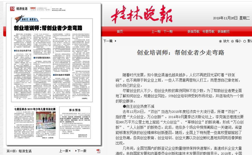 SYB培训已成为培养大学生创新意识和创业能力,促进大学生充分就业的重要措施。今年我校从9月份开始开展SYB培训工作,计划开展5期,1200人,在SYB培训数量和质量上都取得了较大的成效。近日,《桂林晚报》对我校SYB培训情况及师资情况进行了关注报道。